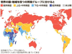 世界銀行は毎年1人あたり国民総所得により、世界の国・地域を四つの所得グループに分類しています。2024年は、低所得(1,135ドル以下)が25、下位・中所得(4,495ドル以下)が50、上位・中所得(1万3,935ドル以下)が54、高所得が87カ国でした。1990年以降、中所得から高所得へ移行できた国・地域は34にとどまっています。中所得国が発展パターンを転換できずに成長が低迷して高所得国入りを果たせないことについて、世界銀行は2007年に中所得国の罠と表現しています。