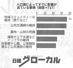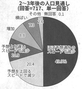 日本経済新聞らの調査によれば、自治体の7割が人口減少が地域社会の維持に影響していると回答しています。人口減が進むとの解答は81.2%で、中でも予想を上回るスピードで人口が減るとの回答は20.4%でした。地域別では、四国の自治体の42.4%が予想を上回る早さで減るが最多でした。都道府県別では、香川県が75%、島根県が66.7%、宮崎県が60%でした。