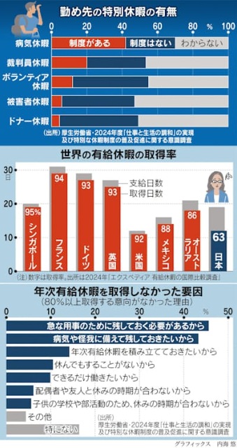 日本は、有給休暇支給日数は低くないのですが、取得率も取得日数も諸外国に比べ低率です。厚生労働省の意識調査では、取得しない理由は、急な用事のために残しておく必要があるが45.6%、病気や怪我に備えて残しておきたいが43.3%と多くなっています。