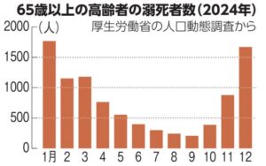 高齢者の入浴中の突然死は、12月~2月に約半数が集中しています。全体の90%が65歳以上の高齢者です。この冬場に増える入浴中の突然死は、ヒートショックや長時間の入浴などが主な原因と考えられています。