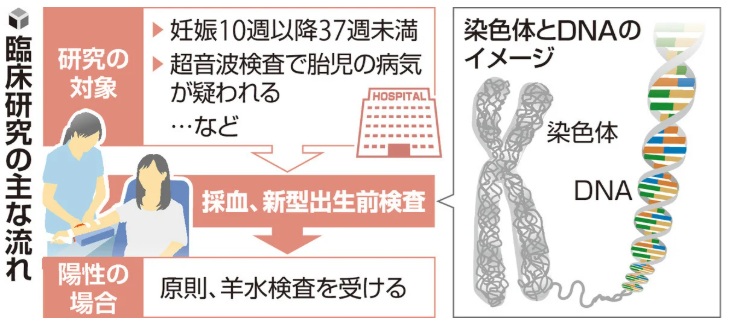 研究の対象は、超音波検査などで胎児の異常が指摘された妊娠10週から37週未満の妊婦や、夫婦どちらかに染色体の一部が入れ替わる転座がみられる場合などに限られます。研究では全ての染色体のうち、一定の長さ以上が消失する欠失や重複がないか調べます。検査で陽性となれば、羊水検査や赤ちゃんが生まれた後の検査で確定させます。