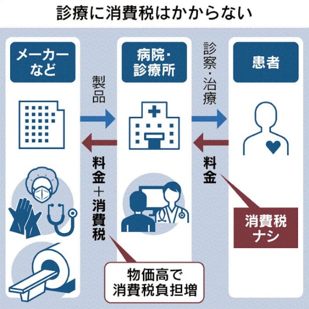 公的な保険診療は、国民の命を守るのが役割であることにより、消費という扱いにはなじまないため非課税となっており、患者が消費税を払うことはありません。しかし、医療機関が機器などを購入するのは消費という位置付けで、消費税を払う必要があります。この差分のコストは、国が定める初診料などの診療報酬にあらかじめ含む形で手当てしています。問題は物価高で消費税が総じて重くなってきています。