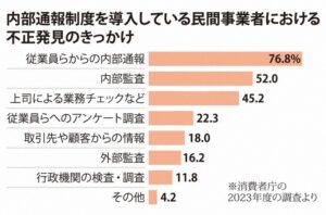 消費者庁が民間事業者に実施した調査結果によれば、内部通報制度を導入している事業者において、不正発見のきっかけとなったのは内部通報が77%と最多でした。内部監査が52%、上司による業務チェックなどが45%、従業員らへのアンケートが22%、取引先や顧客からの情報が18%を上回っています。2016年度の調査時は内部通報が59%にとどまっており、内部通報の果たす役割が高まっています。