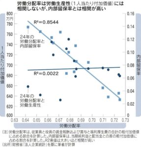 賃上げが抑えられる一方、日本企業の内部留保は積み上がっています。リーマン・ショックの前後で、日本企業の人件費が内部留保と負の相関関係にあるとの研究もみられます。将来の不確実性や投資機会の不足で企業が資本を抱え込み、労働分配率低下に拍車がかかったと分析されています。内部留保の増加も労働分配率の低下に大きく影響しています。