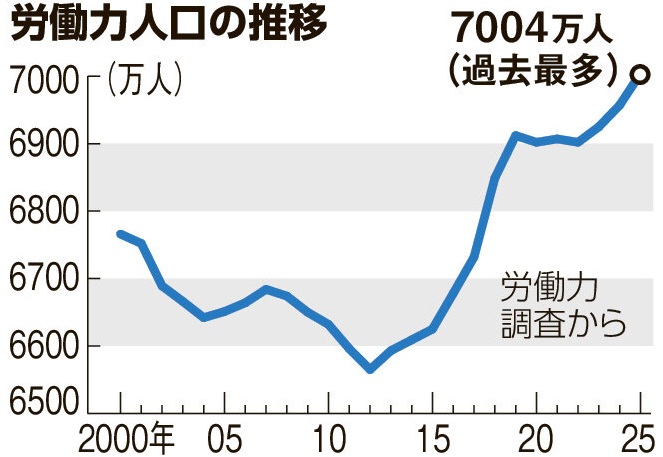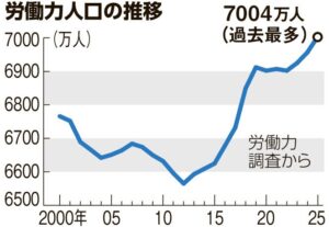 総務省の発表によれば、15歳以上の働く意思がある人の数を示す労働力人口は2025年平均で7,004万人と過去最多となっています。7千万人を超えたのは初です。少子化で生産年齢人口(15~64歳)は減っていますが、働く高齢者や女性、外国人が労働力人口を押し上げています。15歳以上人口に占める割合は63.8%で、過去最高となっています。実際に働いている就業者数も6,828万人と過去最多でした。