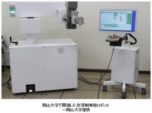 手術や検査に使う医療用ロボットの種類が広がってきています。岡山大学は、CTで撮影しながら治療・検査が可能な針穿刺の専用ロボットを開発しています。医師が遠隔からロボットを操作することで、CTによる医師の放射線被曝を防止することができます。