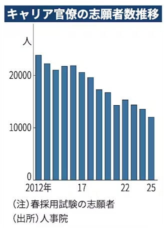 背景には、志願者が減少傾向にあることがあります。総合職では、教養区分以外の試験を実施する春の採用試験で2025年に過去最少の1万2,028人となりました。現行形式の試験になって最多だった2012年春の2万3,881人の半分近くに減っています。