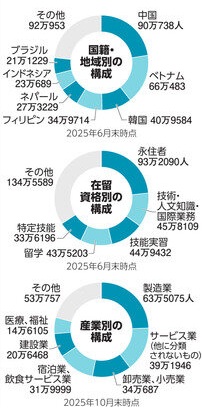 在留資格で最も多いのは永住者の約93万人で、技術・人文知識・国際業務ビザを持つホワイトカラー労働者の約46万人と続き、多くが日本人と交じり合って日常生活を送っています。