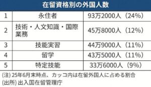 入国後に就学状況や勤務先を申請し、入管庁が個別に審査する方式への切り替えを検討します。留学生が得た収入を納税情報から確認できる仕組みを導入します。2027年から、マイナンバーを活用したデジタル庁のシステムを使います。現行制度では、入管庁が把握できるのは勤務先のみで、勤務時間や所得を確認する手段はありません。正確な所得を把握できれば、週28時間を超える不正就労を特定しやすくなります。
