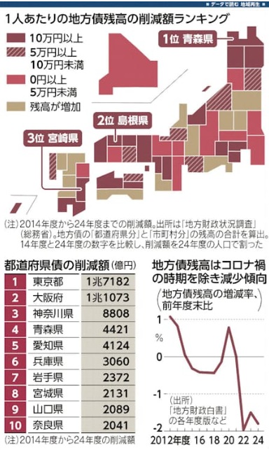 10年間の削減額は、大阪府や東京都など財政規模が大きい自治体が上位ですが、人口1人あたりで換算すると青森県の42.9万円がトップでした。島根県や宮崎県、富山県が続いています。青森県内では、地方債の残高が10年間で総額5,001億円減少しています。人口あたりの削減額で2位の島根県は、市町村が借金の削減に力を入れています。