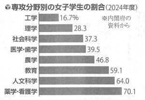 日本は世界と比べて、理系に進む女性が少なく、OECDの2019年の調査によれば、女性の大学入学者のうち、理工系に進んだ人は、わずか7%に過ぎません。保護者や周辺の女子は理系が苦手、女子は文系向きといった意識が影響しているとされています。