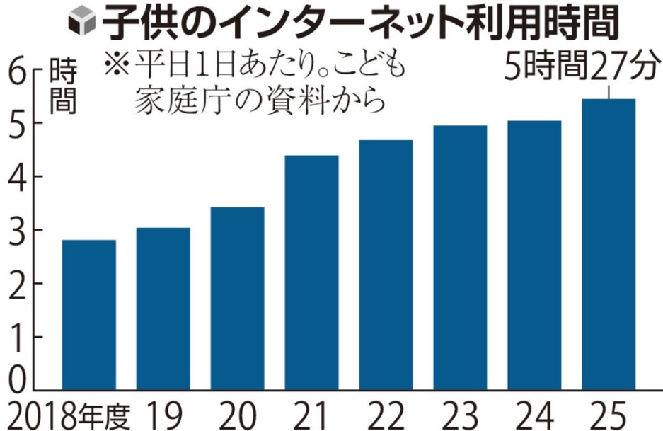 こども家庭庁の調査によれば、小中高生のインターネットの利用時間が平日の1日平均で5時間27分で年々長くなっています。生成AIを日常利用する子どもは3割に上っています。利用時間は全体で前年度より25分長くなっています。小学生は3時間54分、中学生は5時間24分、高校生は6時間44分でした。