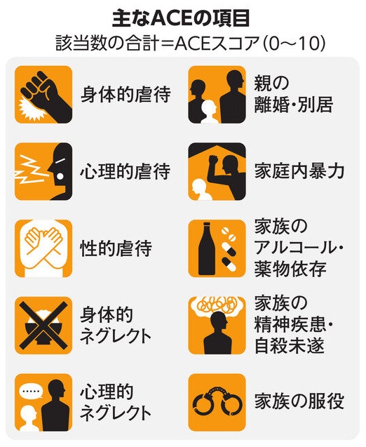 虐待やネグレクトなど、18歳までの子どもにとってトラウマとなりうるような体験を、子ども期の逆境体験(ACE=Adverse Childhood Experiences)と呼びます。ACEは、身体的、心理的、性的虐待やネグレクト、家族の精神疾患や自殺未遂、薬物・アルコール乱用など主に10項目があります。