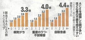 全くACEを経験していない人に比べ、経験した数が多いほど、大人になってから心身の健康上のリスクが高まり、失業や貧困、社会的孤立などの困難に直面しやすいことが明らかになっています。1990年代の米国の研究では、ACEを四つ以上経験した人は、経験がない人に比べて、がんが1.9倍、アルコール依存が7.4倍、希死念慮が12.2倍リスクがあるとされています。2021年に京都大学が行った調査によれば、一つ以上経験したACEサバイバーが38.4%いることが明らかになっています。ACEを経験した数が多い人ほど、心身の不調を抱えやすくなっています。