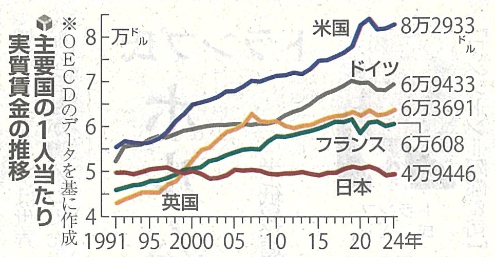 国際的に見ても日本の実質賃金は伸び悩んでいます。OECDによれば、1991~2024年に1人当たり実質賃金(ドル換算)は、米国や英国で1.5倍、ドイツやフランスで1.3倍に増えていますが、日本は横ばいです。
