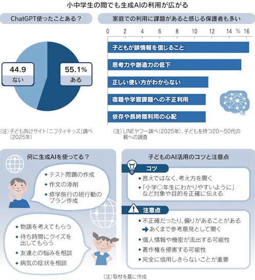 学校でも生成AIの利用は広がっています。文部科学省は小中高向けに生成AIの利用の指針を示し、2024年12月の改訂版では、誤情報や偏りなどのリスクに留意した上で授業での有効な活用を検討するよう求めています。小論文やリポートでAIの生成物をそのまま提出することや、詩や俳句などの創作活動で安易に頼ることは避けるべきと明記しています。