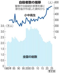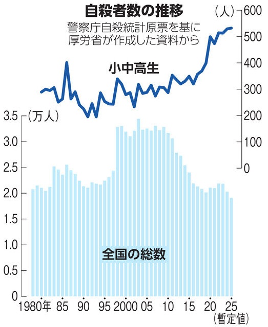 厚生労働省の発表によれば、2025年の小中高生の自殺者数は532人で最多となっています。G7のうち、10代と20代の死因の1位がともに自殺なのは日本のみです。一方、全体の自殺者数は1万9,097人で、統計を開始した1978年以降で初めて2万人を下回っています。人口10万人あたりの自殺者数を示す自殺死亡率は15.4で、過去最小でした。
