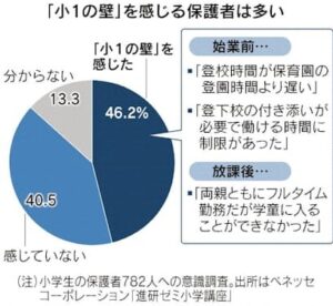 ベネッセコーポレーションの調査によれば、46.2%が小学校入学後に子どもの世話と仕事の両立が難しくなる小1の壁を感じています。小学校の始業時間は保育園に子どもを預ける時間より遅いことがあり、出勤時間との調整に悩む親が少なくありません。