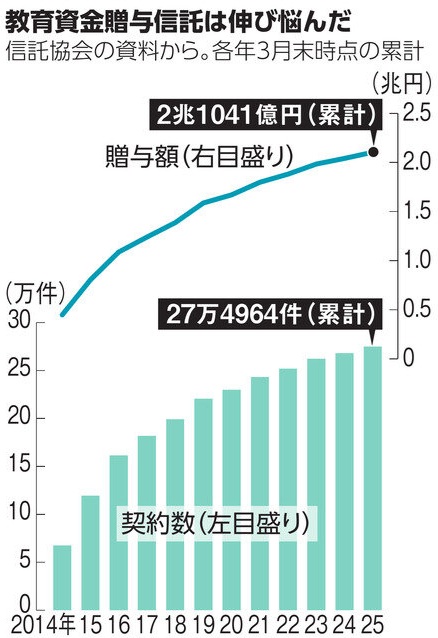 祖父母や親が子や孫に将来の教育費を贈っても課税されない教育資金贈与信託が、3月末で終了しました。2026年度の税制改正で生前贈与をめぐる非課税制度が打ち切りになるためです。利用者が富裕層に偏り、最近は利用が伸び悩んでいました。