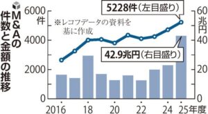 日本企業が2025年度に行ったM&Aの件数と金額がそれぞれ過去最多となりました。2年連続で過去最高を更新しています。また、大型買収が相次いだことで、金額ベースでも88%増の42.9兆円と7年ぶりに過去最高を更新しています。