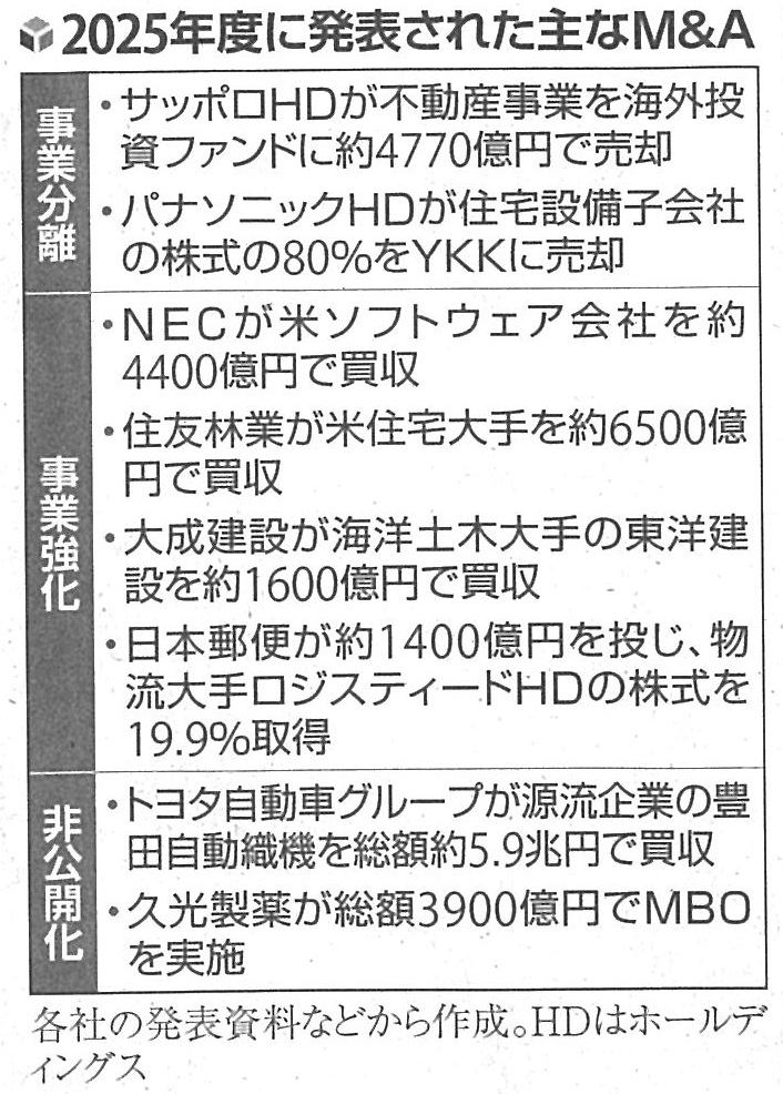 投資家から経営の効率化を求める声が強まり、低収益事業を切り離したケースが目立っています。特徴的な動きの一つが、市場の要請を受けた事業売却です。事業自体の成長を目指すM&Aもあります。日本企業のM&Aが増える背景には、上場企業に対して、成長投資を促す政府や株式市場の要請があります。2026年度は、中東情勢の悪化で先行き不透明感が高まったり、金利の上昇でM&Aに必要な資金の調達が難しくなったりする可能性があります。