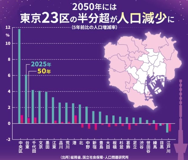 総務省の住民基本台帳に基づく人口の推移をみると、都道府県で唯一、東京は人口が増え続けています。しかし、国立社会保障・人口問題研究所の将来推計人口によれば、2040年の1,451万人をピークに、2045年は1,448万人、2050年は1,440万人と減少します。市区町村別では明暗が鮮明となります。2025年の人口が5年前より減ったのは、東京23区のうち江戸川、目黒のみでしたが、2050年は新宿、練馬、世田谷など13区となります。中央や千代田は増加が続くものの伸びは鈍化します。推計通りなら公共交通網だけでなく地価や税収に影響が出る可能性があります。