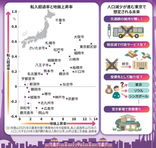 人口流入と地価の動向は一定の関係があります。転入超過率が高い東京都区部や大阪市、福岡市などは、地価の上昇率が他の都市より大きくなっています。住宅や商業関連の需要が拡大すると地価が上がりやすく、東京の人口が減れば地価に下落圧力がかかることになります。