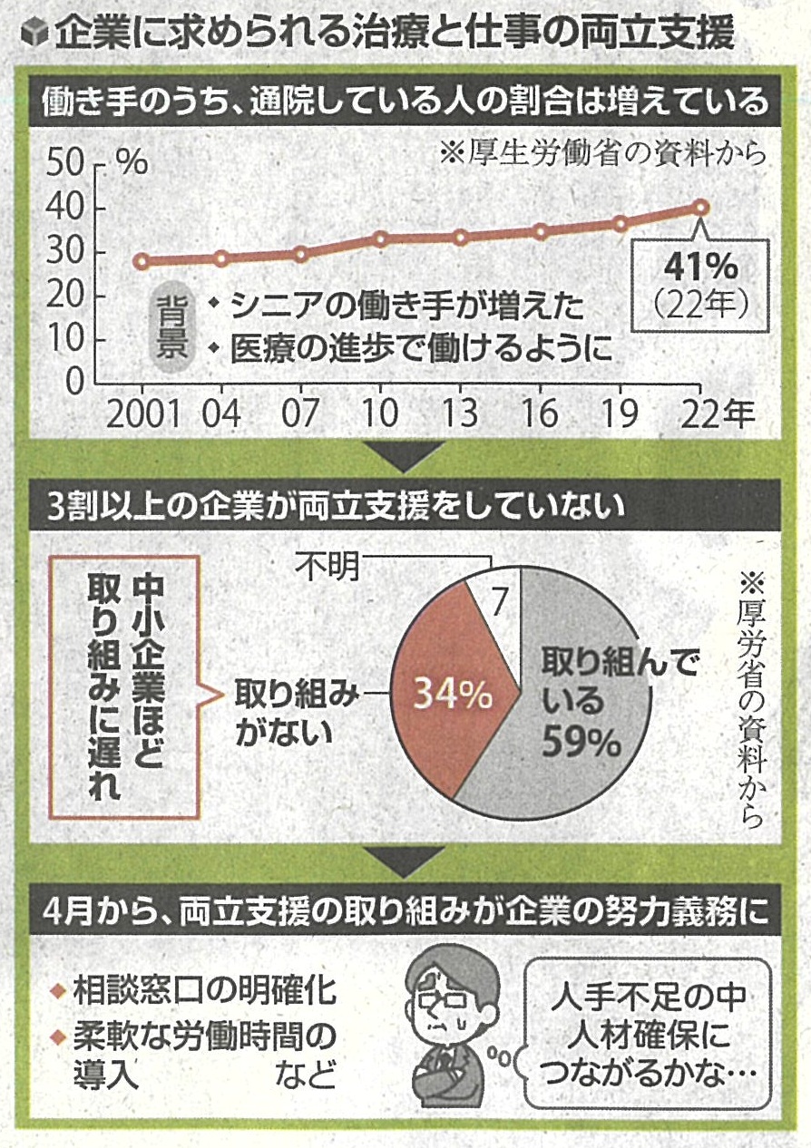 国は、4月から改正労働施策総合推進法に基づき、相談体制の整備など病気の治療と仕事の両立支援に取り組むよう企業に努力義務を課します。生涯に2人に1人ががんになっており、健康を損なうリスクはどの働き手にもあります。人手が不足する中、社員が治療のために働けなくなれば、経営にとってダメージは大きく、企業は両立支援の取り組みを危機管理上の課題と位置づけるべきです。