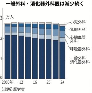 わが国の医師数は、2024年末時点で34万7,772人と過去最多を更新しています。しかしまんべんなく増えているわけではなく、一般外科・消化器外科は減り続けています。若手の調査によれば、外科領域を選ばなかった理由としてワークライフバランスの確保の難しさや、出産・育児・教育の体制が十分でないことを挙げています。