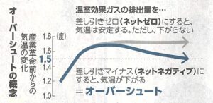 地球の温暖化は累積の排出量にほぼ比例します。ネットゼロを達成してもそれまでの排出量が一定を超えてしまえば、一度上がった気温は元に戻りません。上がった気温を下げて今世紀末までに1.5度に戻すのが、オーバーシュートの考え方です。ネットゼロを達成したあとに、大気中からCO₂を取り除いて、濃度を下げるネットネガティブを達成・持続させることで気温の低下が可能になります。オーバーシュートのない1.5度目標の達成というのはもう難しくなっています。