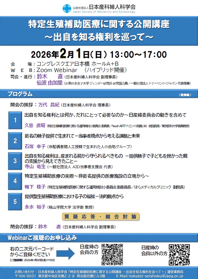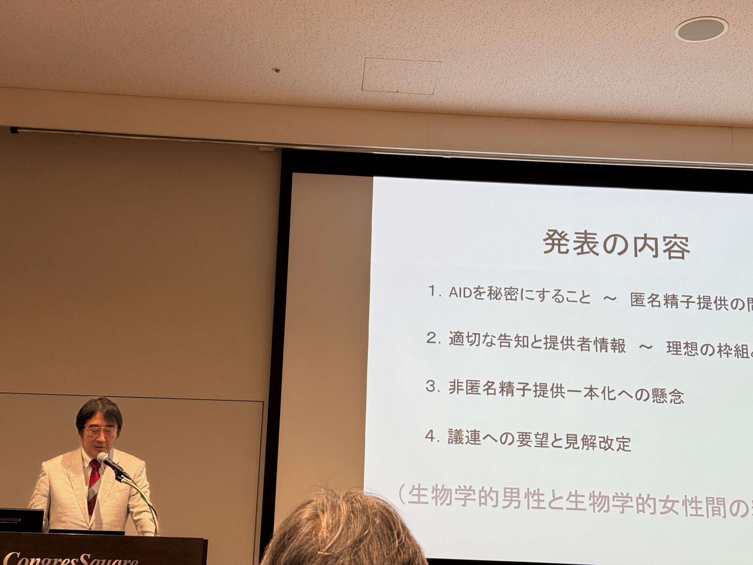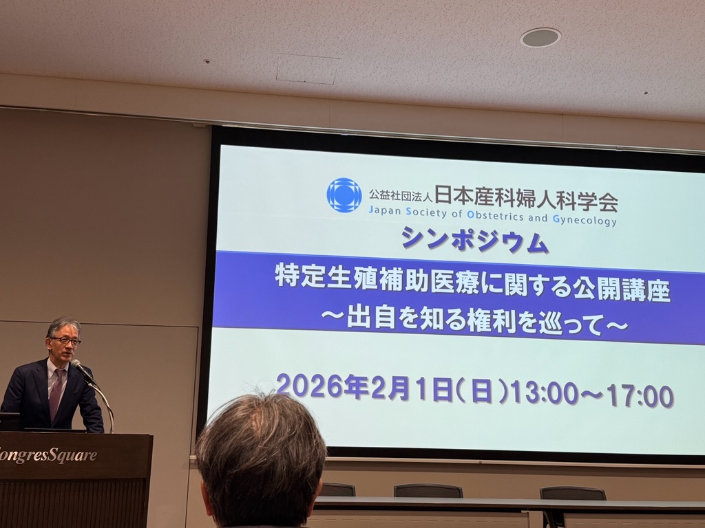日本産科婦人科学会主催の「特定⽣殖補助医療に関する公開講座〜出⾃を知る権利を巡って〜」がコングレスクエア日本橋で開催されました。第三者の介する生殖補助医療を実施する際に、子どもの出自を知る権利をどのように考えるかは大変重要な問題です。