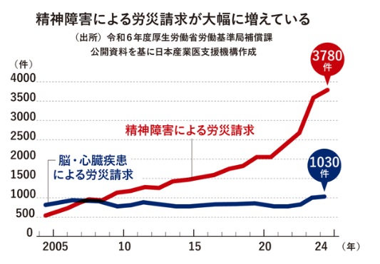 厚生労働省によれば、2024年度の精神障害による労災請求は脳・心臓疾患の3.7倍に達し、労働安全衛生調査では、メンタル不調による休職または退職した従業員がいると回答した事業所は、全体で12.8%、大企業では9割以上を超えています。今のままでは名ばかり産業医が、メンタル不調による休職を助長しかねない状況です。メンタル不調で休みたいという社員が医師に診断書を書いてもらい、それを会社に持参して休職を求めるケースが増えています。