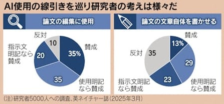 論文の執筆にAIをどこまで取り入れるべきかについては、研究者の間でも意見は分かれています。英科学誌ネイチャーの調査によれば、AIを使った校閲などの編集については9割以上が賛成と答えた一方、論文執筆への使用に関しては65%にとどまっています。ネイチャーでは、現状AIを論文の著者として認めていません。論文の内容は人間の研究者が責任を持ち、データ解析などにAIを利用した場合でも開示するよう求めています。
