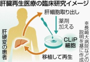 長崎大学らの研究チームは、患者の細胞を使って肝臓を再生させる臨床研究を始めたと発表しています。患者の細胞を薬物を使って肝臓や胆管の細胞に分化する前駆細胞に変化させる技術を活用し、肝硬変などの進行性の肝疾患の治療を目指します。