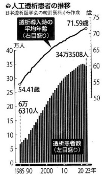 見直しを迫られる背景には、透析患者の高齢化があります。日本透析医学会によれば、透析を導入する患者の平均年齢は1985年の54.41歳から、2023年には71.59歳に上がっています。透析に至る主な原因の糖尿病の治療が向上し、導入までの期間が延びています。