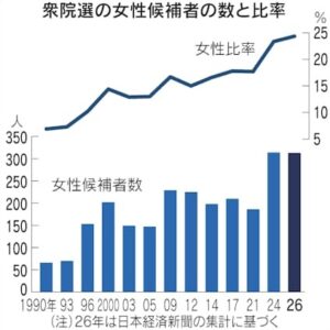 今回の衆院選の候補者の女性比率は24.4%で、前回の23.4%を上回り過去最高となっています。政党別では参政党が80人超で最多です。共産党が70人弱、立憲民主党と公明党による中道改革連合と自民党が40人台で続いています。