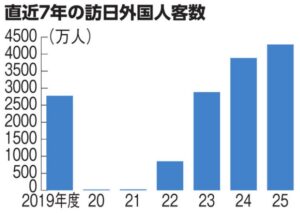 日本政府観光局の発表によれば、2025年度に日本を訪れた外国人客は4,282万9,443人で、年度として初めて4千万人を上回りました。前年度の3,884万9,540人より397万人増えています。円安や訪日人気によって韓国や台湾などアジアの旅行者数が大幅に増えているほか、米国や欧州、豪州からの客数も伸びています。消費額も増えており、訪日客の消費額は過去最高となる9兆4,549億円でした。