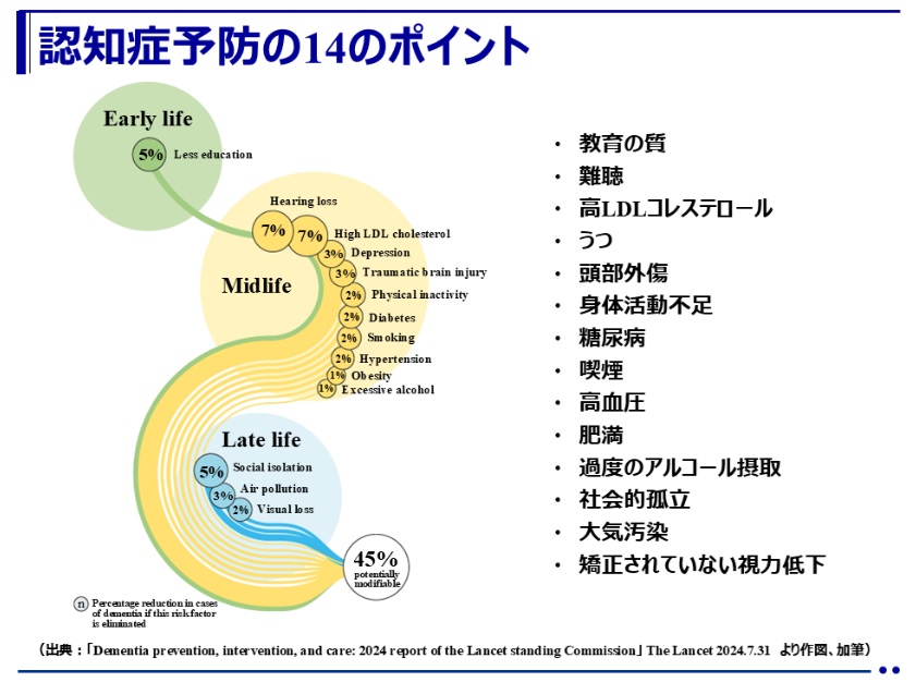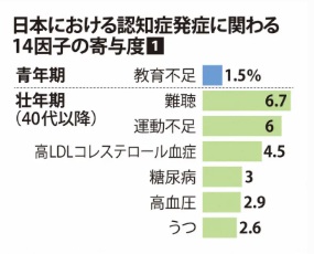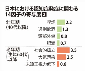東海大学らの研究グループは、認知症の4割は予防できるとの研究成果をランセットに発表しています。ランセットの機関が、認知症の危険因子と特定している高血圧、肥満、うつ、運動不足、喫煙、難聴、視力低下、社会的孤立など14項目を対象に、日本人を対象とした調査結果です。全て投薬や補聴器装着などの適切な治療・処置を受けたり、運動や禁煙など適切な行動などをとったりすることで、治癒や症状の改善が可能な項目です。