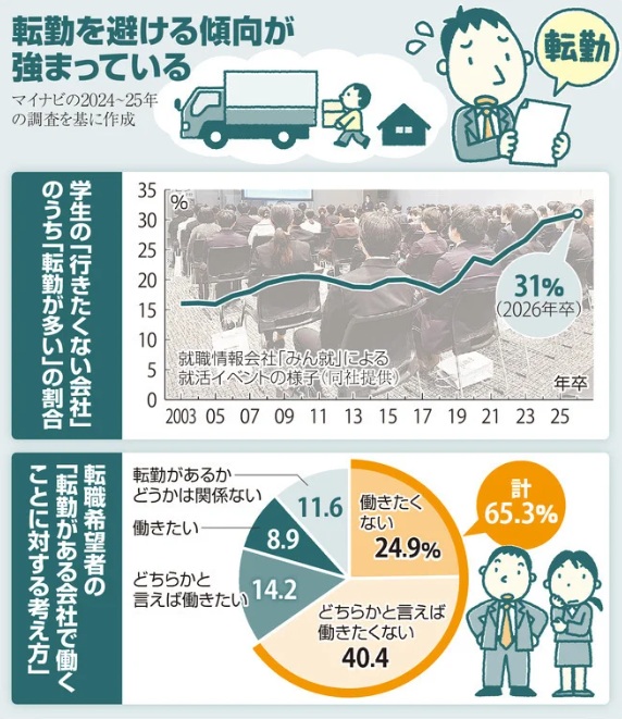就職情報会社マイナビによる今年卒業予定の大学生が回答した調査によれば、行きたくない会社を尋ねると転勤が多いが2位の31%を占め、5年連続で増えています。20~50歳代の転職希望者の調査でも計65.3%が、転勤がある会社で働きたくないと答えています。共働き世帯が増え、夫の単身赴任、妻の退職など転勤による家庭への負担が重くなったことが大きいとされています。