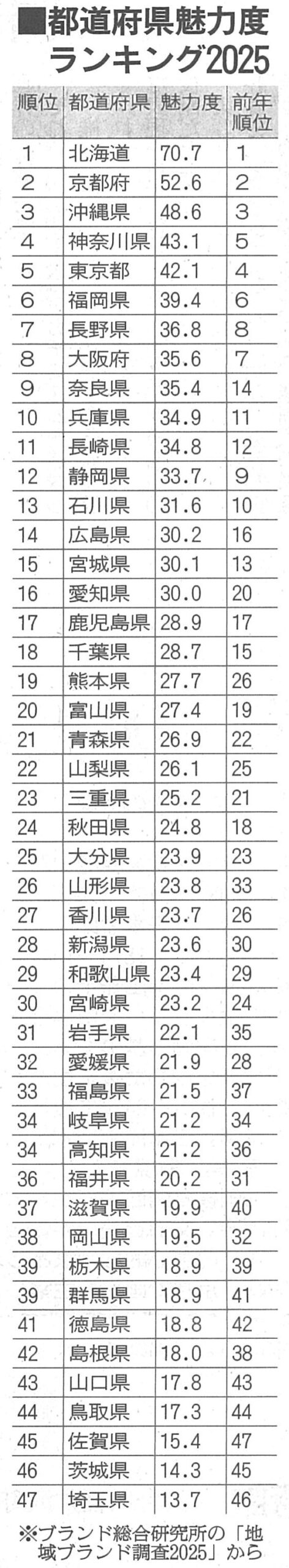 民間調査会社のブランド総合研究所発表の都道府県魅力度ランキングによれば、1位は昨年に続き北海道、2位は京都府、3位は沖縄県と続いています。認知度や魅力度などこのランキングは、90の項目を数値化して順位をつけています。