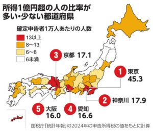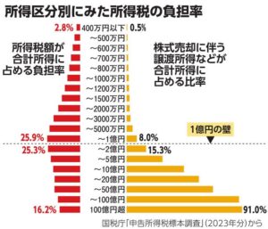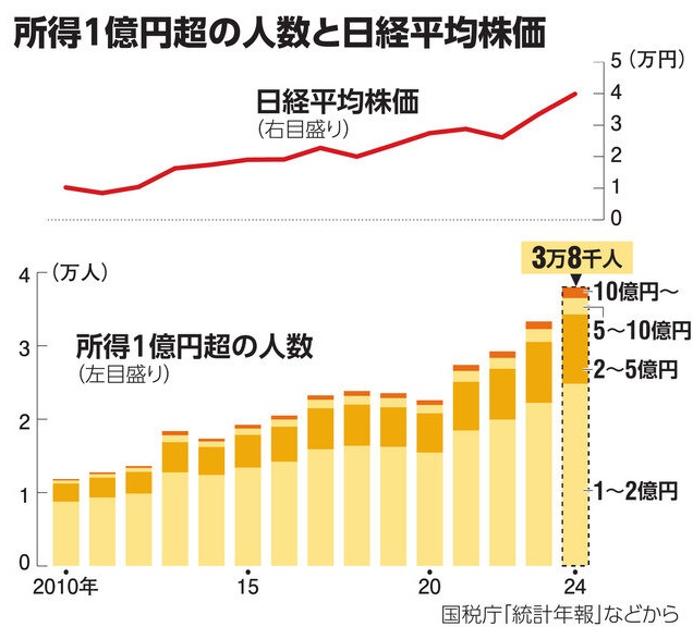 増えた一因は、近年の株や不動産の価格上昇です。高額所得者は給与や事業だけでなく、株や不動産の売買による譲渡所得の占める比率が高くなっています。働いて得るお金よりも資産から得る分が、より大きく伸びています。