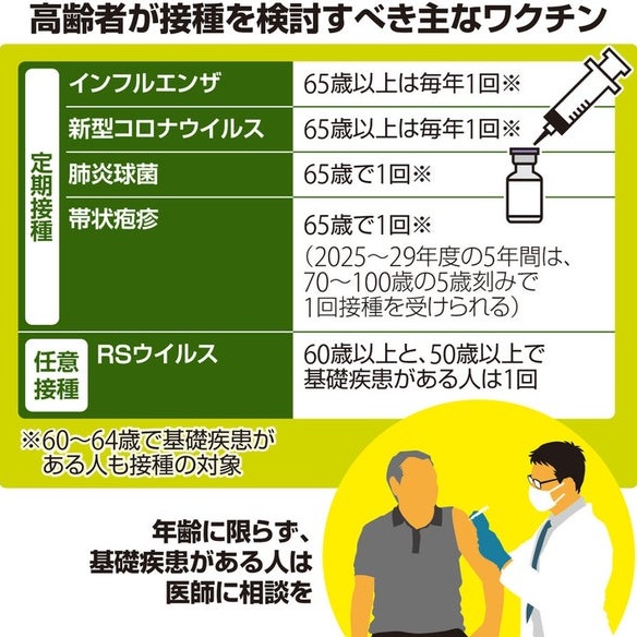 高齢者の感染拡大や発症、重症化を防ぐ効果が確認されたワクチンには、公費の助成を受けられる定期接種があります。まずはインフルエンザと新型コロナウイルスのワクチンです。高齢者に多い肺炎などの合併症や入院を要する重症化のリスクも減らします。より効果が高いとされるインフルエンザの高用量ワクチンが、10月から75歳以上を対象に定期接種となる予定です。