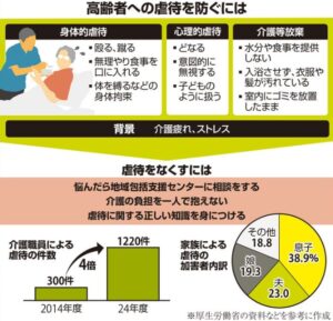 家族らによる虐待の件数は、2024年度に1万7,133件と高止まりしています。加害者の内訳は息子が38.9%と最も多くなっています。認知症のある親とのコミュニケーションが難しいことや、介護疲れ、ストレスなどが要因とされています。介護の負担を一人で抱え込まないことが大切です。地域包括支援センターに相談し、介護保険サービスを使いこともできます。