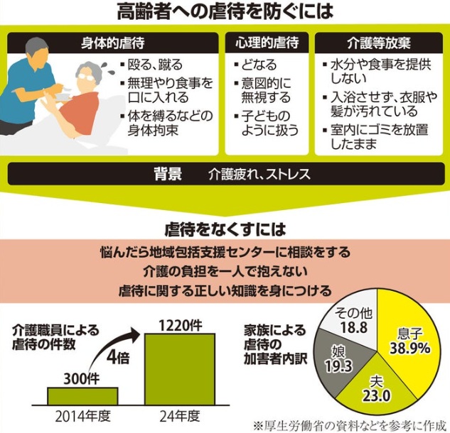 虐待で最も多いのは身体的虐待です。他に、侮辱したり、怒鳴ったりといった心理的虐待、日常的に金銭をわたさないなどの経済的虐待があります。水分や食事を提供しない、室内にゴミを放置したままにするといった介護などの放棄も虐待に当たります。お互いに虐待という自覚がない場合さえあります。尊厳を持って暮らせるよう、虐待は無くさなければなりません。