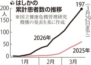 国立健康危機管理研究機構の発表によれば、感染力が強い麻疹の患者数が、今年に入って3月29日までで197人に達しています。コロナ禍後で最多となった前年同時期の60人と比べ3倍以上に達しています。子どもへのワクチンの定期接種などを呼びかけています。都道府県別でみると、最多の東京が48人で、鹿児島が24人で続いています。