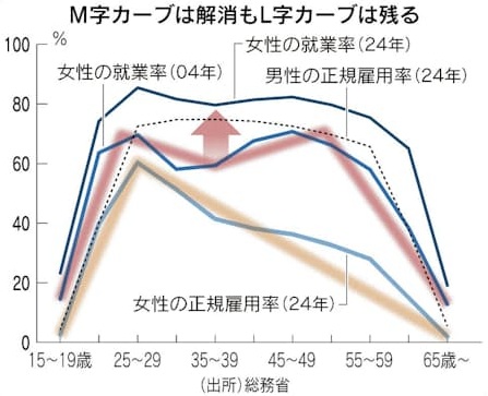 M字カーブ解消後も、女性の正規雇用率が20代後半をピークに下がるL字カーブが残っています。女性が結婚・出産後に仕事をセーブすることがペナルティーになっています。出産を経て女性の収入が減る母の罰と呼ぶ問題が、30代の消費活動の足かせになっています。