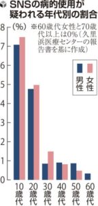 国立病院機構久里浜医療センターのまとめによれば、SNSの利用について、依存性が高い病的使用が疑われる人は10~20歳代で6%に上っています。国内の人口に換算すると140万人規模となります。過去1年間のユーチューブやXなどの利用状況について尋ねた結果、病的使用の疑いに該当したのは、10歳代で男性7.1%、女性7.5%、20歳代で男性4.8%、女性5%に上っています。30歳代以上の各年代は0~1%台でした。